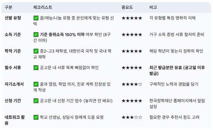 아래 도표는 2025년 꿈사다리 장학금 신청 시 반드시 확인해야 할 핵심 사항들을 요약한 체크리스트입니다.