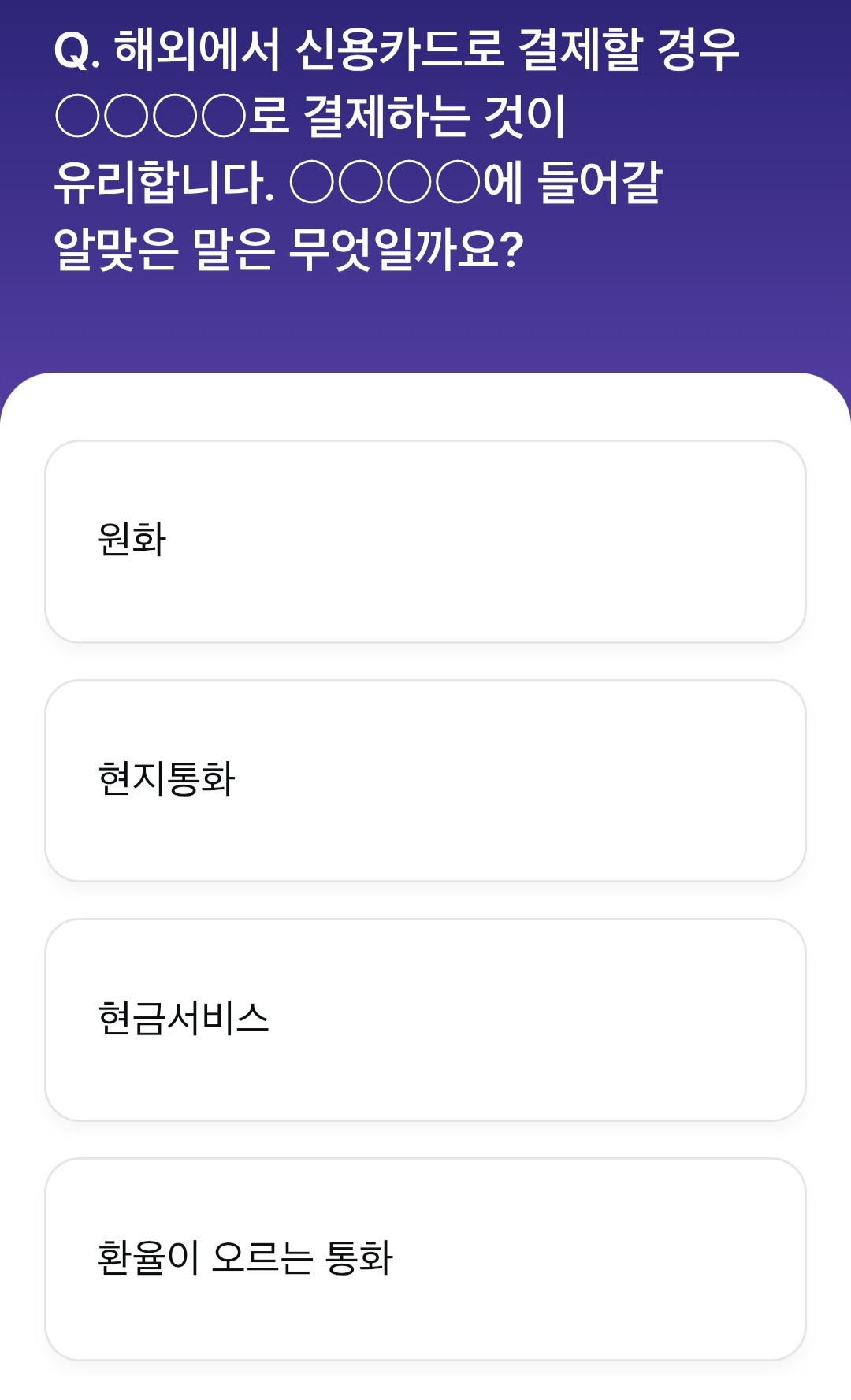 모니모니스쿨 4교시 문제는 "해외에서 신용카드로 결제할 경우 OOOO으로 결제하는 것이 유리합니다. OOOO에 들어갈 알맞은 말은 무엇일까요?" 였습니다. 그리고 정답은 바로 '현지 통화' 입니다.