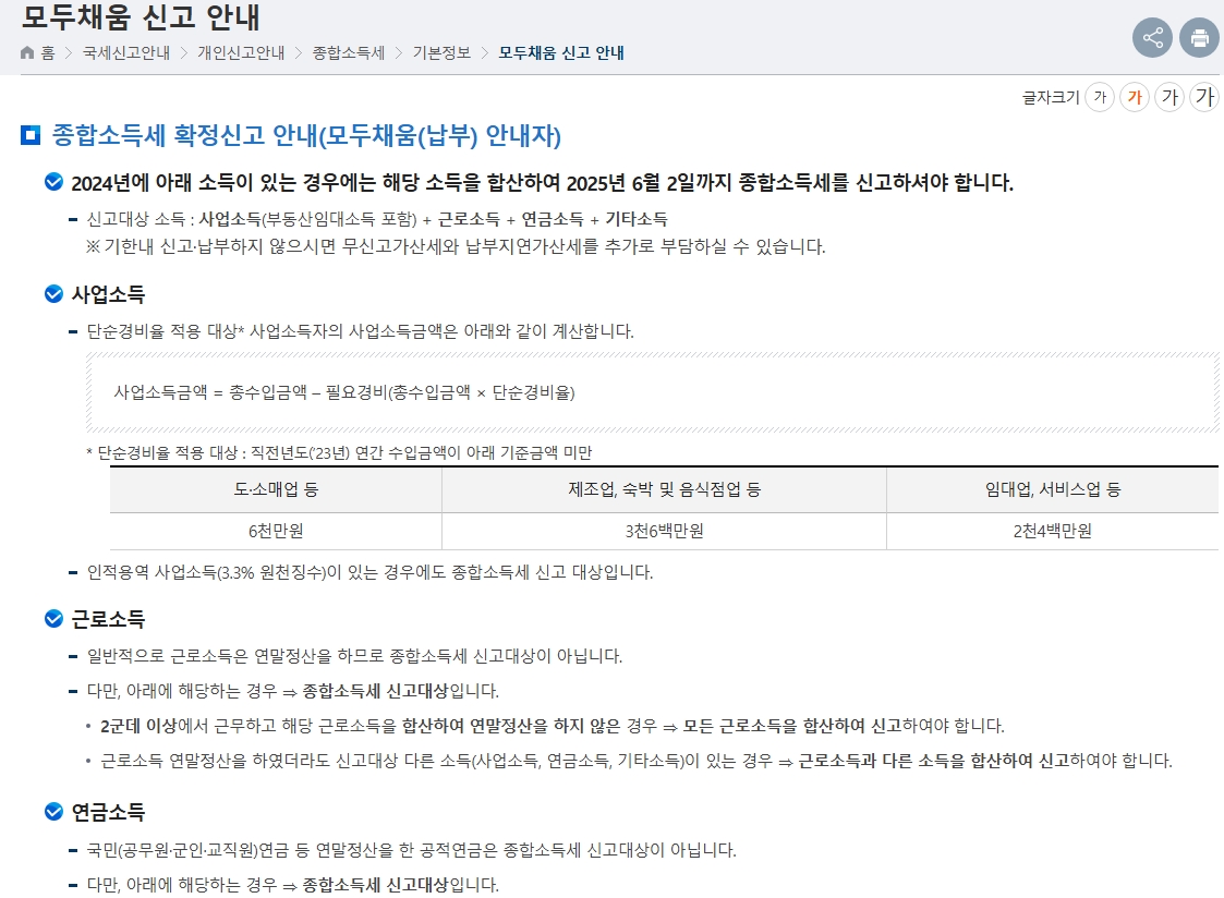 - 세금 신고 복잡성: 국세청이 파악한 소득 외에 다른 소득이 많지 않아 신고 내용이 비교적 단순한 경우