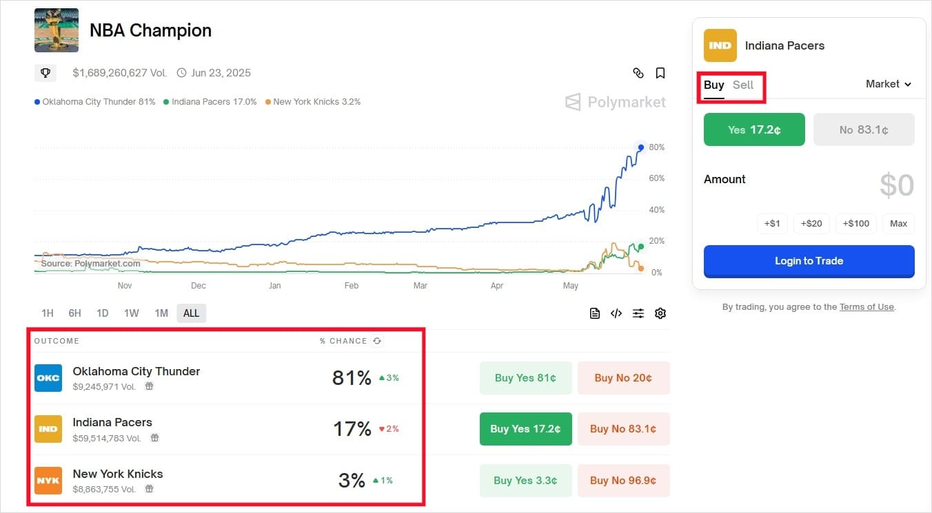 - 시장 정보 확인: 각 시장에는 'Yes'와 'No' 또는 여러 옵션(예: 각 후보자의 이름)이 있으며, 현재 예측 확률과 유동성(베팅된 총액) 정보를 확인할 수 있습니다.